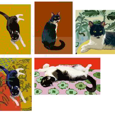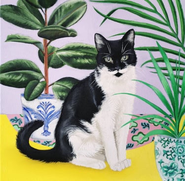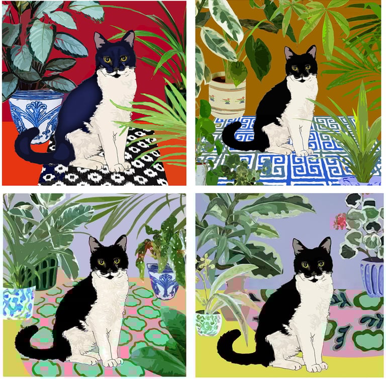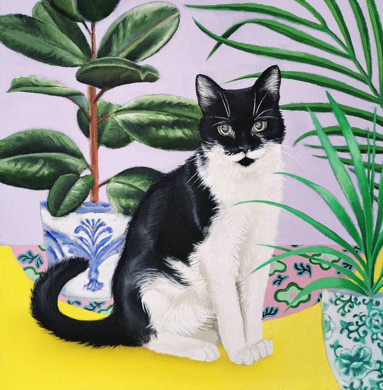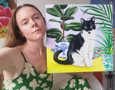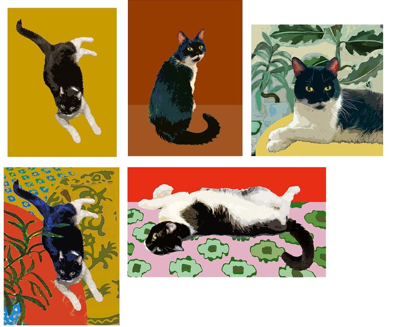 The first thing to do is send me as many photos as you can of the pet, meanwhile we have a dialogue over email and/or phone where you fill me in on its personality and a little backstory, point out any photos that capture the essence of the pet the most. We discuss sizes, colours and styles. Do you want something with bright colours or patterns? Do you want me to include some recognisable details of the house for example a favourite chair or rug?