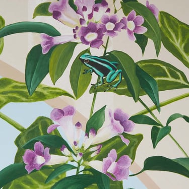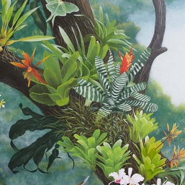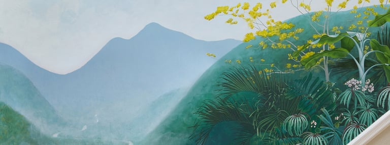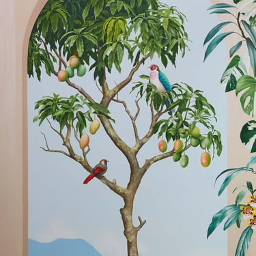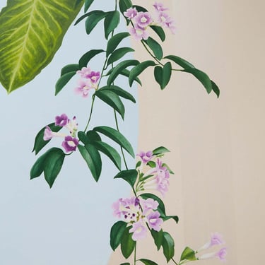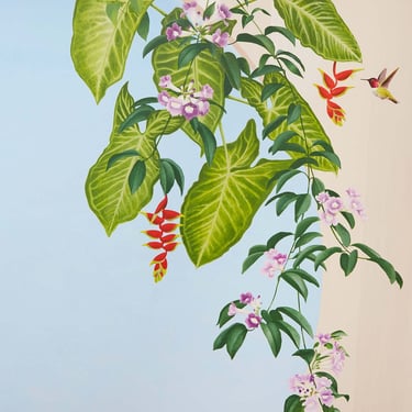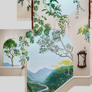 My client wanted something spectacular in their home that would transport them to a tropical rainforest fantasy, inspired by their travels around the world. Their only stipulation was that the mural should contain a golden Buddha like the ones they saw in Myanmar, and that the plants should appear to cascade down the walls in a chaotically lush manner.